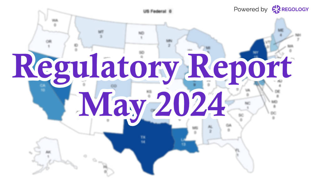 1Regology database statistics filtered by jurisdiction [US federal/50 states], status [applicable bills only], and time period [May 1 – 31, 2024].