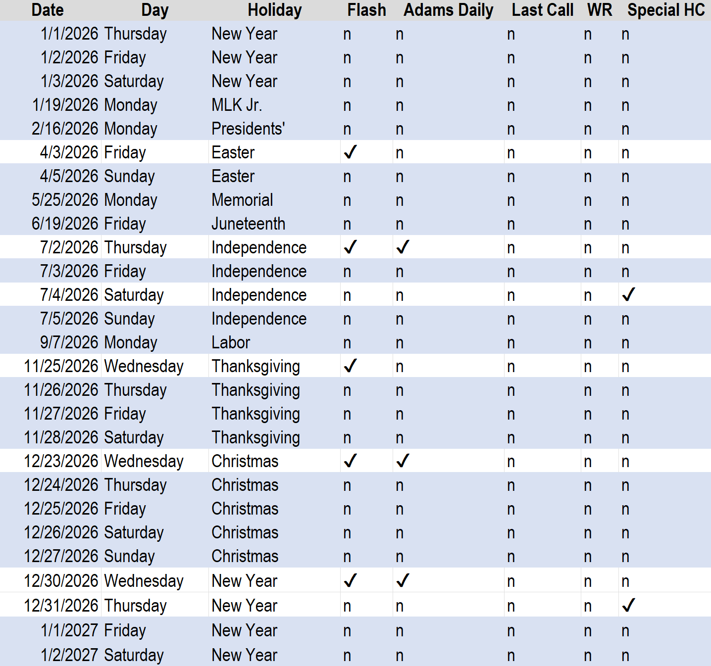 Rows highlighted in blue signify no reports that day. A checkmark specifies a specific report will be sent that day. If a date is not on here, reports will be issued typical to that day.